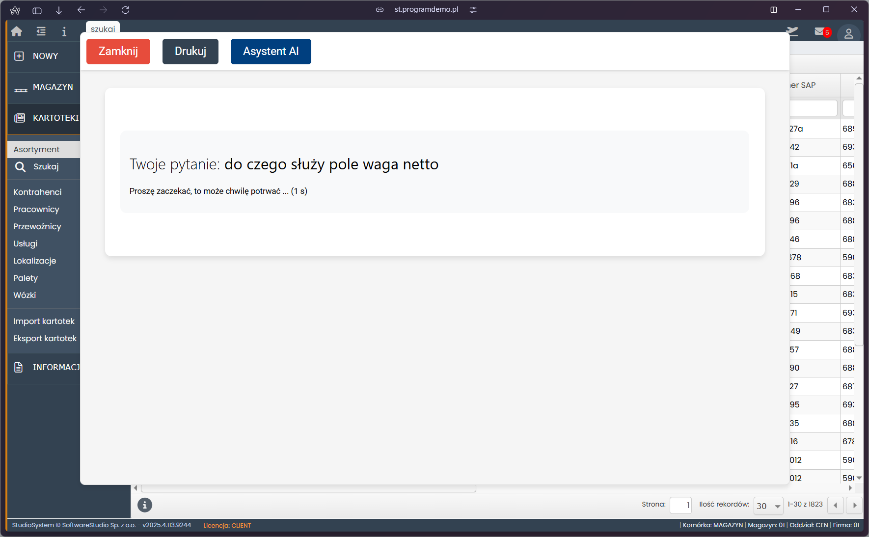 Prawdziwa rewolucja w dostępie do wiedzy przychodzi wraz z implementacją sztucznej inteligencji bezpośrednio w środowisku programu magazynowego. SoftwareStudio, idąc z duchem czasu, wzbogaciło swój system Studio WMS.net o moduł Asystenta AI. Jest to inteligentny, konwersacyjny interfejs, który działa na zasadzie czatu. Zamiast szukać informacji w zewnętrznej dokumentacji, użytkownik może teraz otworzyć okno asystenta i zadać mu pytanie w prosty, naturalny sposób, tak jakby rozmawiał z człowiekiem. Przykładem może być zapytanie widoczne na zrzucie ekranu: „do czego służy pole waga netto”. System natychmiast analizuje intencję pytania i w ciągu kilku sekund udziela precyzyjnej odpowiedzi.