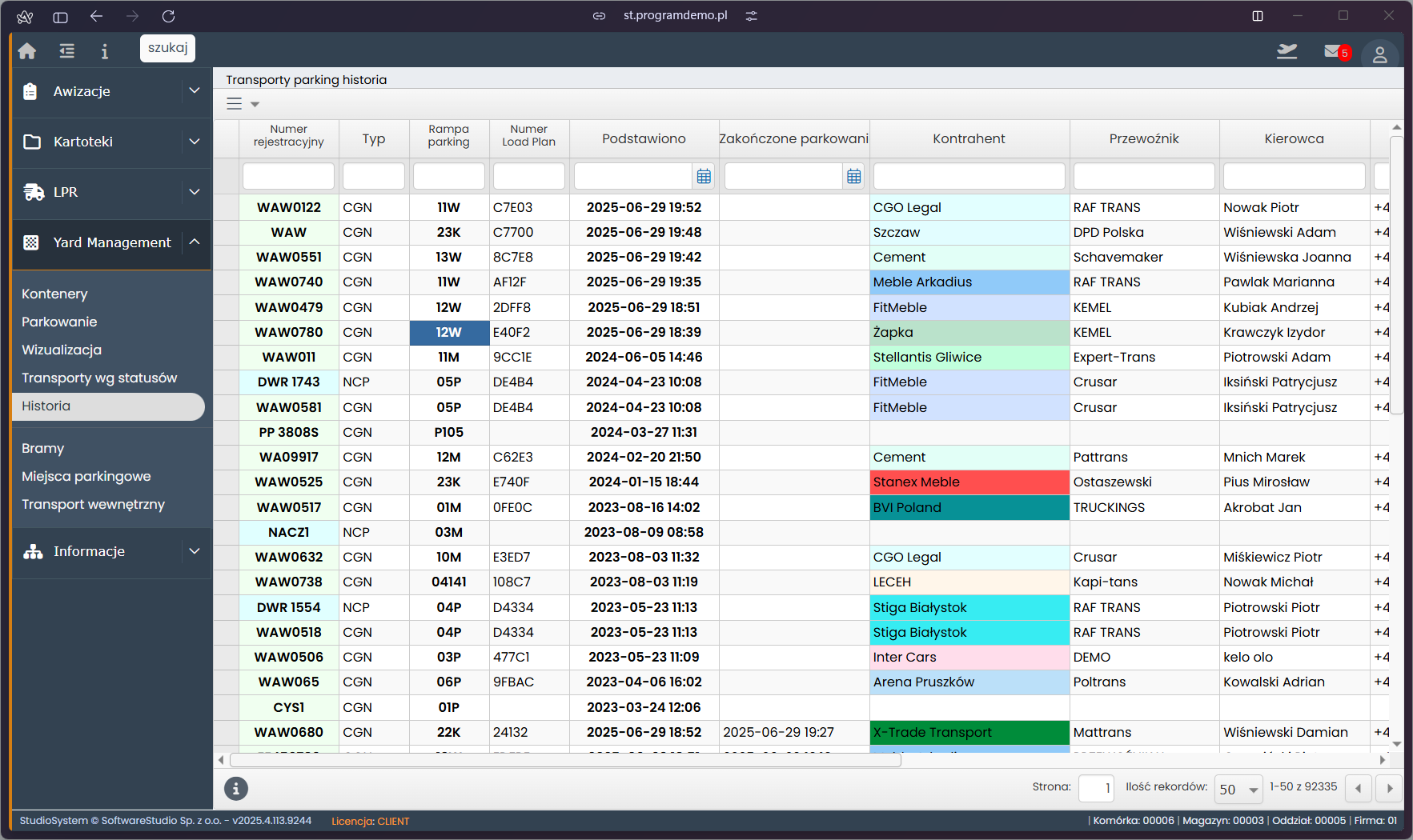 Tabela historii transportów w Yard Management wyświetla szczegółowe informacje o wszystkich pojazdach, które odwiedziły plac manewrowy. Dlatego administratorzy logistyki mogą śledzić dane takie jak numer rejestracyjny, data przyjazdu i odjazdu oraz status operacji. Ponadto kolumny obejmują informacje o przewoźniku i typie ładunku, co ułatwia identyfikację wzorców. W efekcie menedżerowie zyskują kompleksowy widok na przeszłe aktywności, co pomaga w planowaniu przyszłych awizacji.