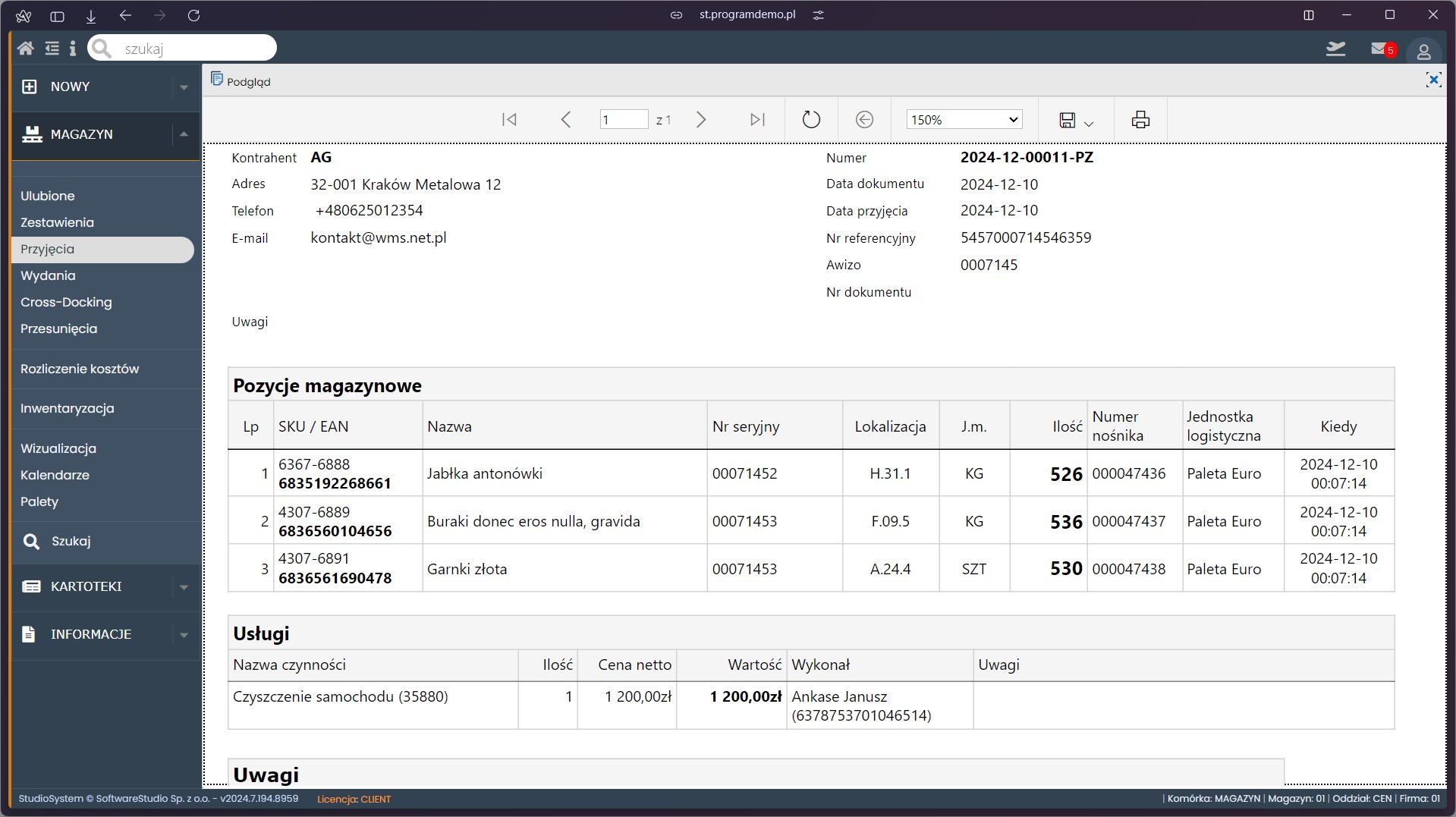 Prezentowany ekran pochodzi z modułu Magazyn w systemie Studio TCS.net i przedstawia pełny podgląd dokumentu przyjęcia zewnętrznego (PZ). Dokument ten stanowi ewidencję wprowadzenia towaru do magazynu wraz z przypisaniem go do odpowiednich lokalizacji, jednostek logistycznych i kontrahenta. Funkcjonalność ta umożliwia kontrolę poprawności danych magazynowych oraz szybki wgląd w historię operacji logistycznych.