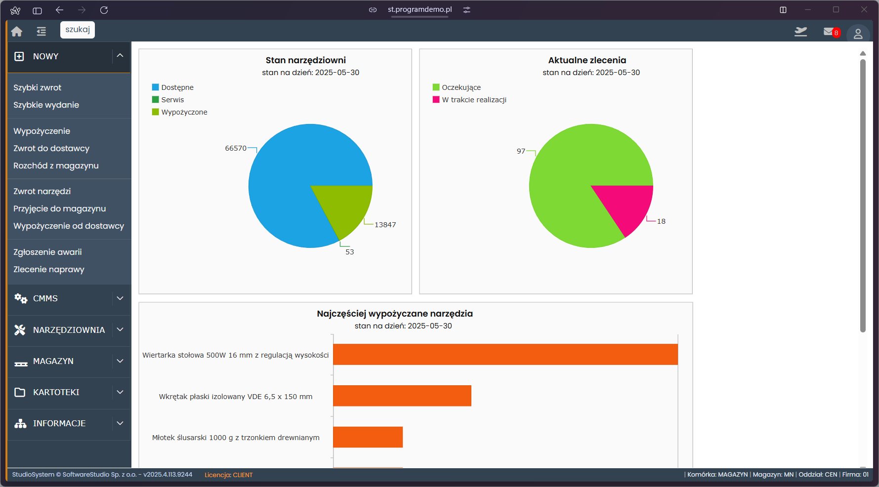 Panel prezentuje dane analityczne dotyczące narzędziowni – stan narzędzi, aktualne zlecenia oraz najczęściej wypożyczane narzędzia