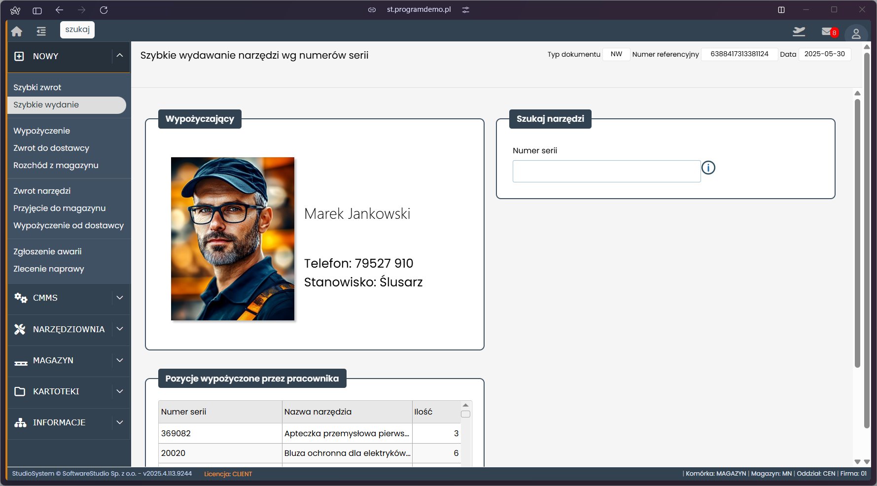 Ekran szybkiego wydawania narzędzi z danymi pracownika i wyszukiwaniem po numerze serii