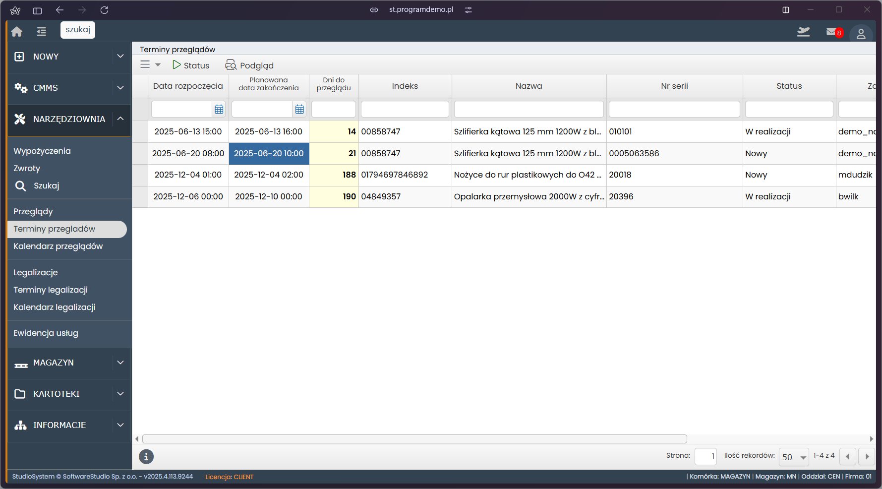 Dolny pasek informacyjny pokazuje wersję oprogramowania, licencję oraz dane identyfikacyjne magazynu i firmy, co potwierdza zintegrowany charakter systemu. Takie rozwiązanie wspiera użytkowników w utrzymaniu porządku w dokumentacji przeglądów oraz w zapewnieniu pełnej zgodności z procedurami bezpieczeństwa i utrzymania ruchu. Widok ten stanowi kluczowy element codziennej pracy administratorów narzędziowni oraz osób odpowiedzialnych za konserwację sprzętu.