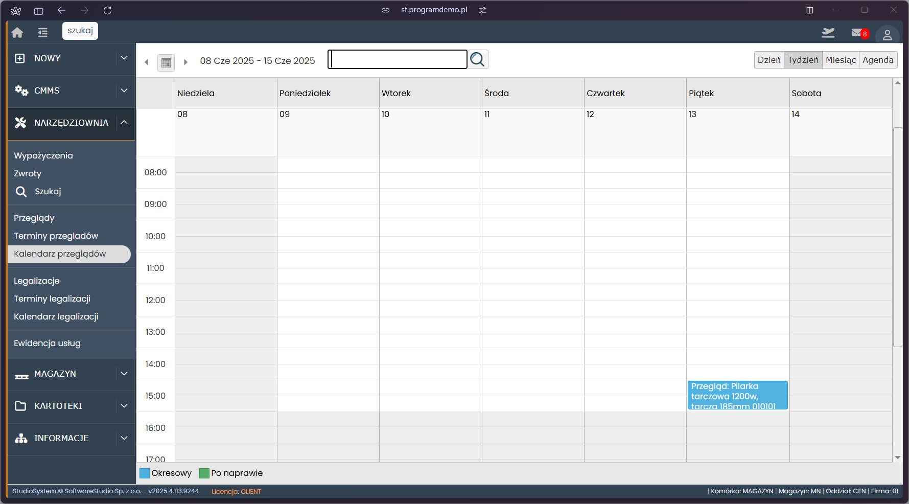 Widok przedstawia moduł Kalendarz przeglądów, będący częścią systemu CMMS/Narzędziownia, używanego do organizowania i kontrolowania terminów przeglądów technicznych sprzętu. Użytkownik korzysta z tej sekcji, aby sprawdzić zaplanowane przeglądy, dodać nowe lub edytować istniejące wpisy. W centralnej części ekranu widoczna jest tabela kalendarza w układzie tygodniowym, obejmująca dni od 8 do 14 czerwca 2025 roku. Wiersze oznaczają godziny pracy od 8:00 do 17:00, co pozwala łatwo przyporządkować konkretne czynności do wybranych przedziałów czasowych. W dolnej części widnieje legenda informująca o kolorach statusów – „okresowy” i „po naprawie”. W kolumnie piątku (13 czerwca) znajduje się wpis z opisem: „Przegląd: Piła tarczowa 1200W, tarcza 185mm 010101”, co wskazuje na zaplanowany przegląd konkretnego narzędzia.