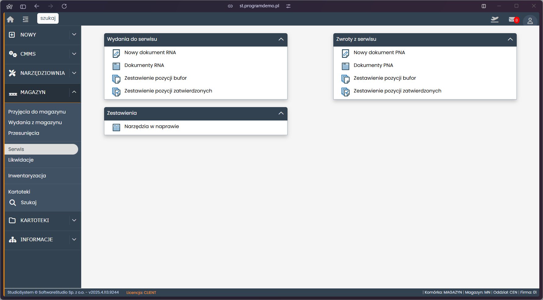 Po lewej stronie ekranu znajduje się menu nawigacyjne, istotne dla szybkiego przełączania kontekstu pracy, a użytkownik wybiera inny moduł jednym kliknięciem. Menu umożliwia przenoszenie się między kluczowymi modułami systemu, takimi jak magazyn, narzędziownia, system CMMS czy kartoteki. Co więcej, z tego poziomu użytkownik dociera do sekcji „Serwis”, w której aktualnie pracuje, jak też do innych ważnych funkcji. W ten sposób dostępne są także moduły likwidacji, inwentaryzacji oraz przegląd kartotek narzędziowych.