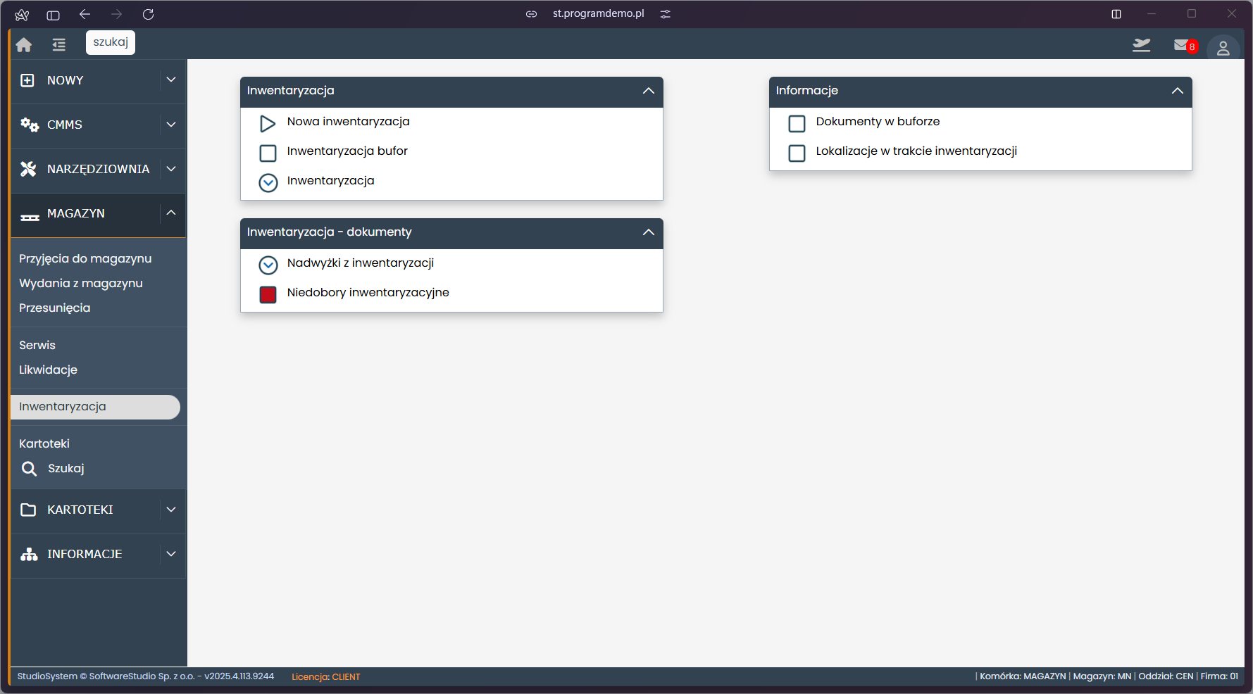 Widok modułu inwentaryzacji w systemie Studio TCS.net z opcjami tworzenia nowych inwentaryzacji, przeglądania nadwyżek i niedoborów.