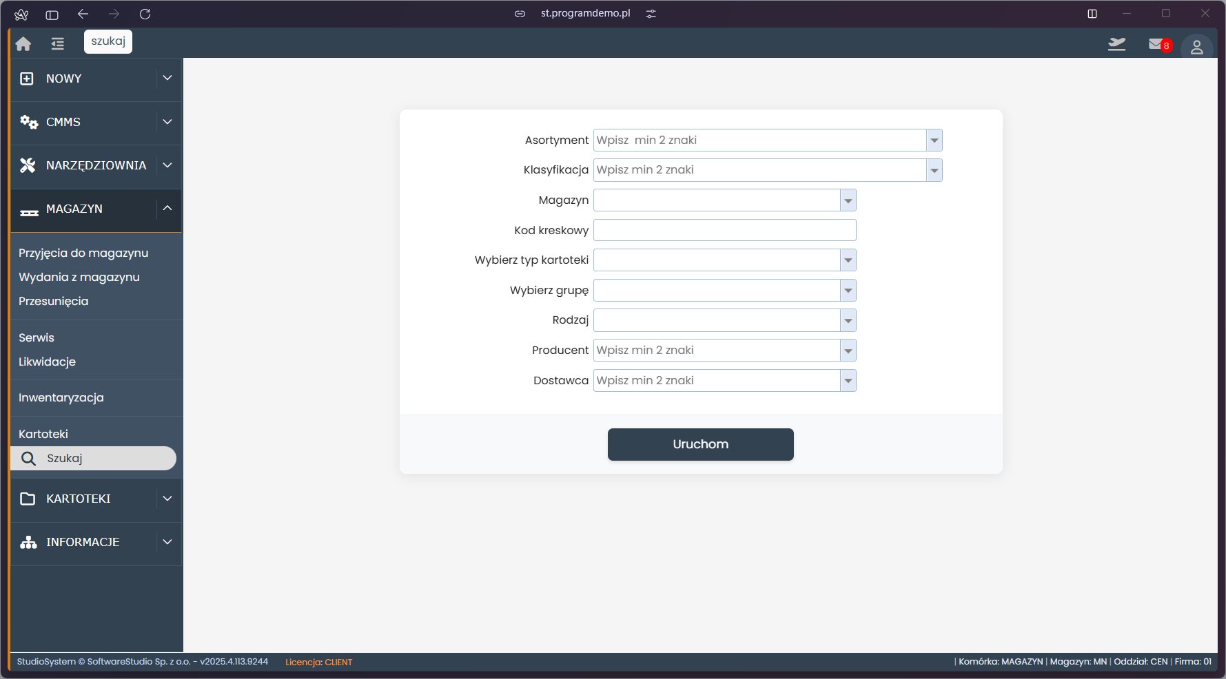Moduł wyszukiwania kartotek w systemie Studio TCS.net został specjalnie zaprojektowany, aby zapewniać użytkownikom szybki i precyzyjny dostęp do danych magazynowych. Formularz wyszukiwania pozwala efektywnie filtrować pozycje według wielu zaawansowanych kryteriów. Pracownik może wyszukiwać według asortymentu, klasyfikacji, magazynu, a także kodu kreskowego, typu kartoteki, grupy, rodzaju, oraz producenta czy dostawcy. Ta szeroka paleta kryteriów umożliwia odnalezienie nawet bardzo szczegółowych informacji o każdym zasobie.