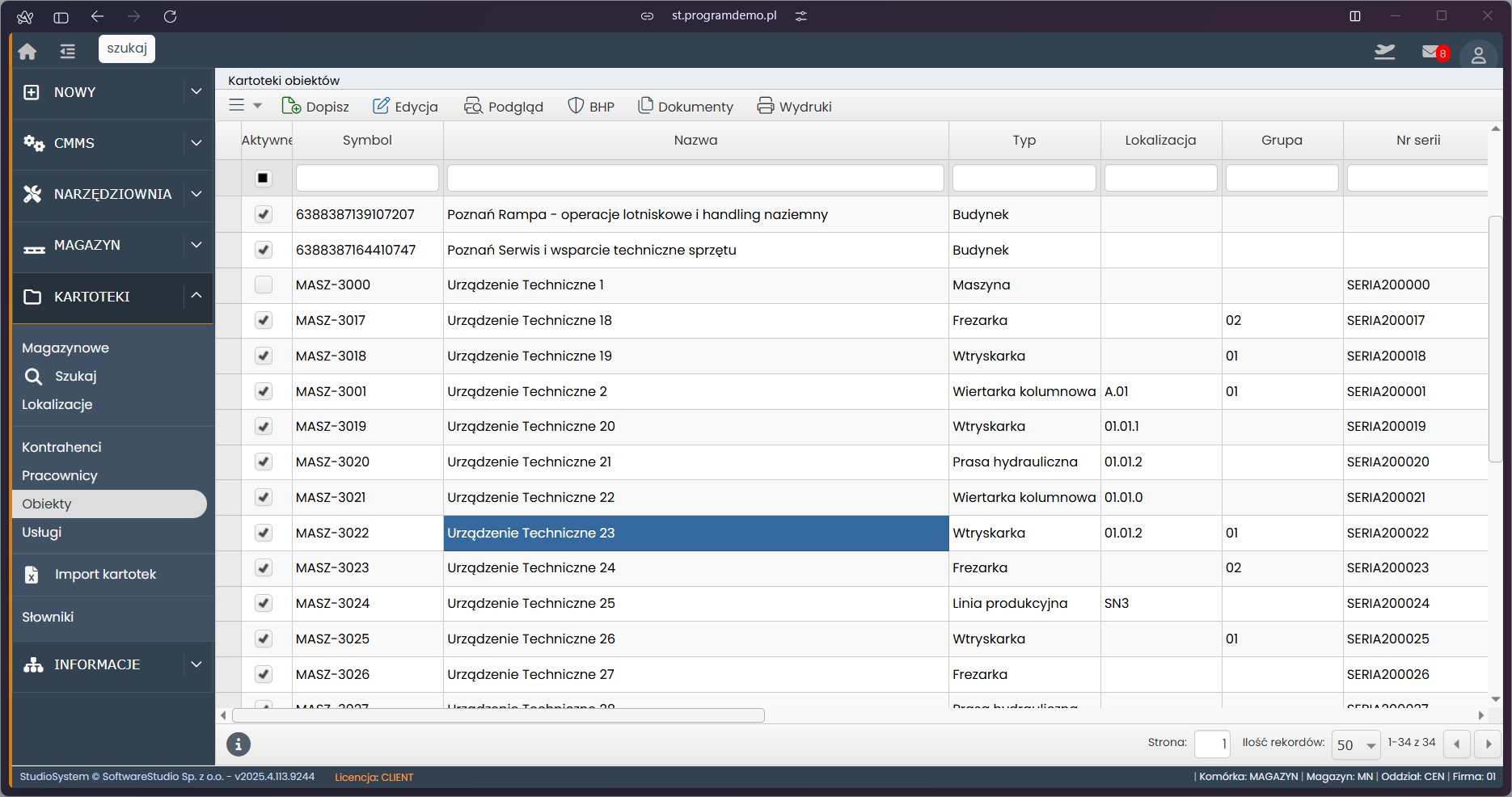 System powiązuje obiekty z raportami serwisowymi i harmonogramami przeglądów. Dzięki temu wspiera kompleksowe zarządzanie utrzymaniem ruchu (CMMS) oraz efektywną ewidencję sprzętu. Moduł zapewnia pełną transparentność procesów eksploatacyjnych, co jest kluczowe dla optymalizacji kosztów. Intuicyjny interfejs zawiera funkcje filtrowania i wyszukiwania, które przyspieszają odnajdywanie konkretnych pozycji. Pracownicy mogą na bieżąco monitorować status aktywności urządzeń i szybko reagować na awarie.