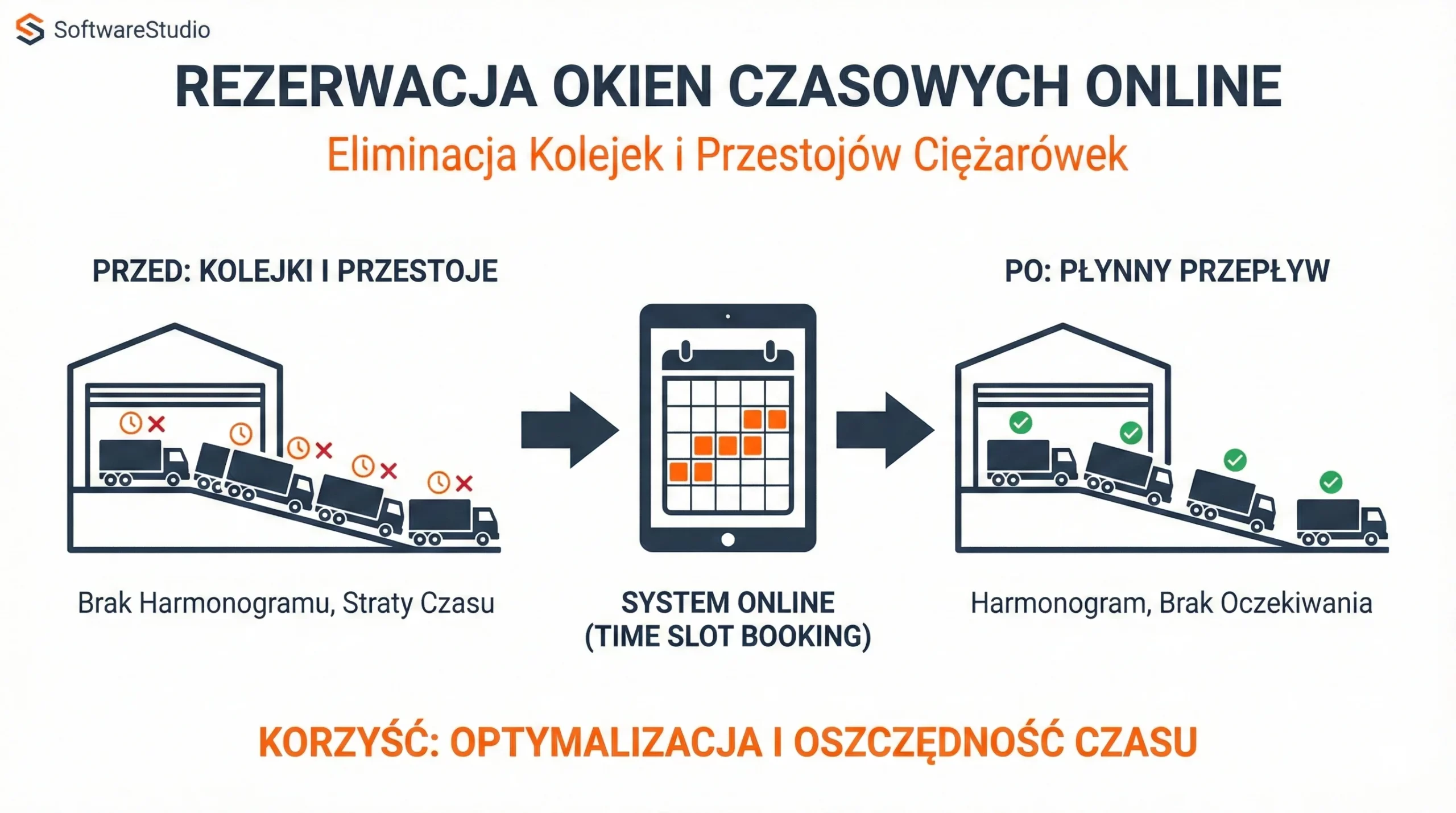 Wprowadzenie precyzyjnych okien czasowych (Time Slot Management) pozwala na równomierne rozłożenie obciążenia ramp przeładunkowych w ciągu całej doby. Magazyn uniknie nagłych kumulacji pojazdów, co pozwala na optymalne zaplanowanie obsady personelu i sprzętu do rozładunku. Przewidywalność operacji przekłada się na mniejszy stres pracowników oraz znaczną redukcję kosztów związanych z przestojami i karami za przetrzymywanie aut.