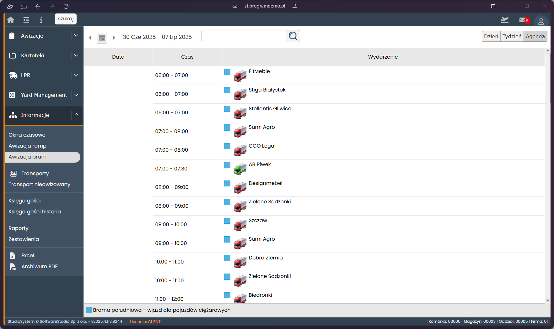 System Studio VSS.net oferuje funkcjonalność awizacji bram, co jest kluczowe dla sprawnego zarządzania dostawami. Zobaczysz przejrzystą listę wszystkich wydarzeń, a także możesz śledzić planowane dostawy i wyjazdy. Dostępne są różne widoki harmonogramu: dzienny, tygodniowy oraz agendy.