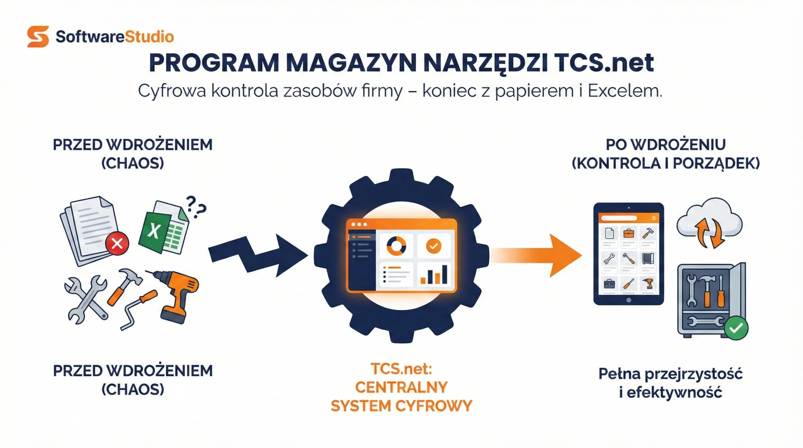 Porównanie chaosu papierowego z kontrolą w programie magazyn narzędzi TCS.net od SoftwareStudio.