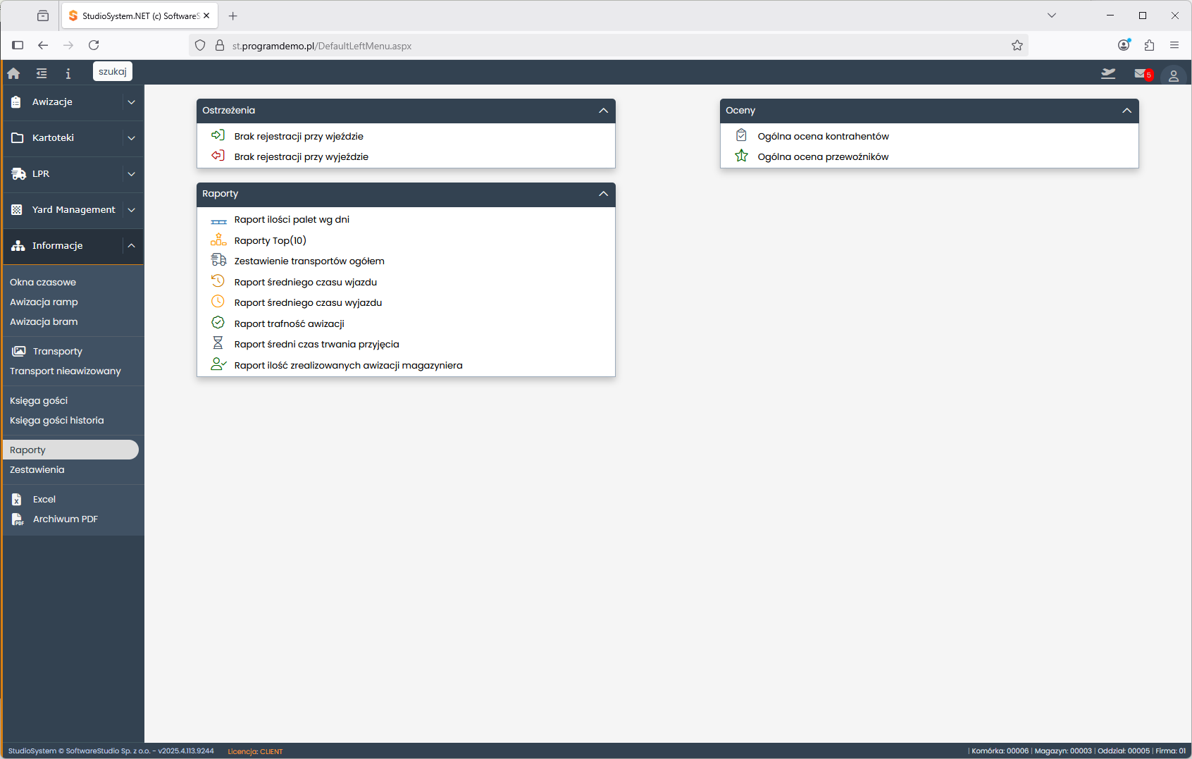 Na pulpicie menedżerskim znajdują się interaktywne widżety, z których każdy pełni określoną funkcję. Widżet „Ostrzeżenia” natychmiast sygnalizuje problemy wymagające interwencji, takie jak brak danych rejestracyjnych przy wjeździe lub wyjeździe, co pozwala na szybkie uzupełnienie braków i uniknięcie problemów w dalszych etapach procesu. Z kolei widżet „Raporty” stanowi bramę do głębszej analizy, oferując bezpośredni dostęp do predefiniowanych zestawień. Ponadto, widżet „Oceny” daje szybki wgląd w jakość współpracy z kontrahentami i przewoźnikami, co wspiera budowanie solidnych relacji biznesowych. Dzięki takiej organizacji informacji, menedżer ma pełen obraz sytuacji i może podejmować decyzje w oparciu o aktualne dane.
