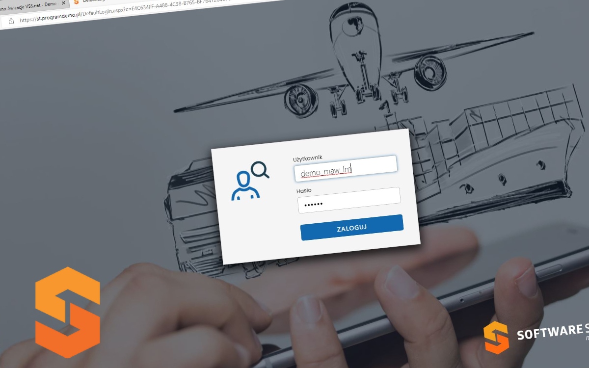 Jako użytkownik otwieram ten ekran, aby potwierdzić tożsamość i uzyskać dostęp do modułów operacyjnych związanych z transportem, spedycją i magazynem w ramach program magazynowy WMS. Interfejs jest minimalistyczny i skupiony na działaniu: brak zbędnych elementów nawigacyjnych, dzięki czemu proces wejścia do systemu jest szybki i bezpieczny. Motyw tła (samolot, statek, ciężarówka) wskazuje, że po zalogowaniu czekają mnie funkcje dotyczące łańcucha dostaw i obsługi zleceń TSL.