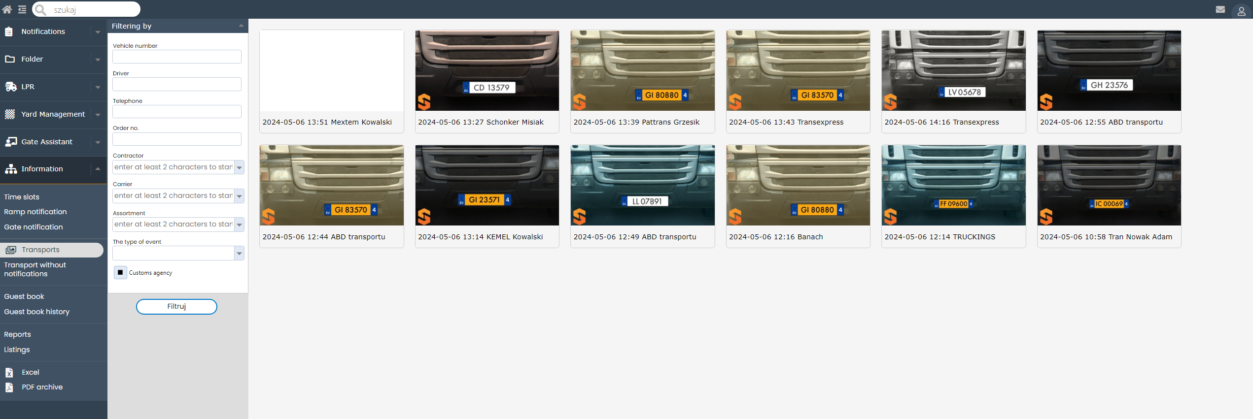 Użytkownik może przejść do szczegółów wybranego transportu poprzez kliknięcie miniatury, co zwykle otwiera dedykowane okno z dodatkowymi informacjami (np. numerem zamówienia, przewożonym towarem czy statusem odprawy). W ten sposób możliwe jest szybkie monitorowanie ruchu pojazdów i weryfikacja poprawności danych. Interfejs jest czytelny i umożliwia intuicyjny przepływ pracy — od filtrowania po analizę zdjęć i eksport raportów. Całość wspiera proces zarządzania ruchem na bramach zakładu, zwiększając bezpieczeństwo i przejrzystość logistyki transportowej.