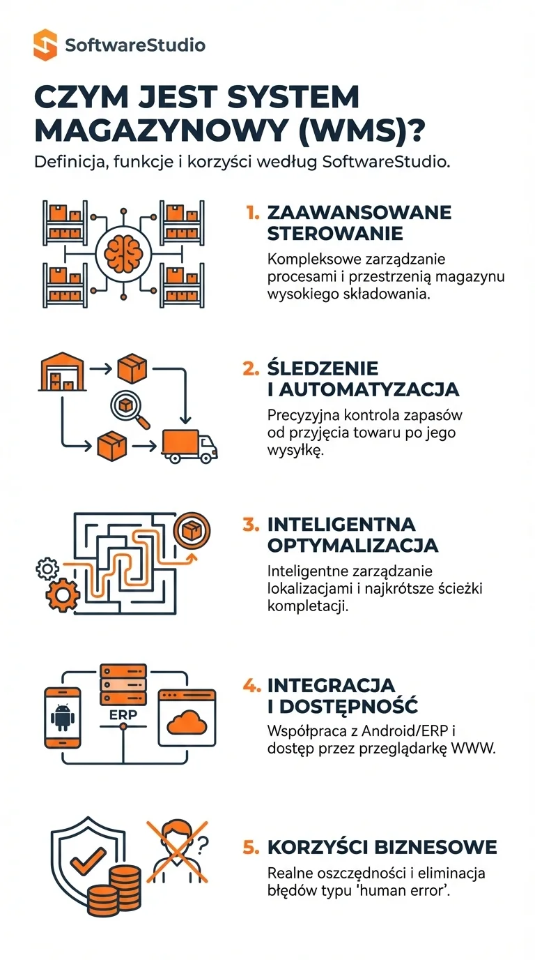 W SoftwareStudio definiujemy system magazynowy jako oprogramowanie klasy Warehouse Management System (WMS), którego głównym zadaniem jest precyzyjne śledzenie zapasów, kontrola przestrzeni składowej oraz automatyzacja procesów od przyjęcia towaru po jego wysyłkę. W przeciwieństwie do prostych programów magazynowych, zaawansowany WMS optymalizuje ścieżki kompletacji i zarządza lokalizacjami w sposób inteligentny, co znacząco podnosi wydajność operacyjną. Co więcej, nasze Studio WMS.net oferuje funkcjonalności wykraczające poza zwykłą ewidencję, zapewniając pełną integrację z terminalami mobilnymi Android oraz systemami ERP.