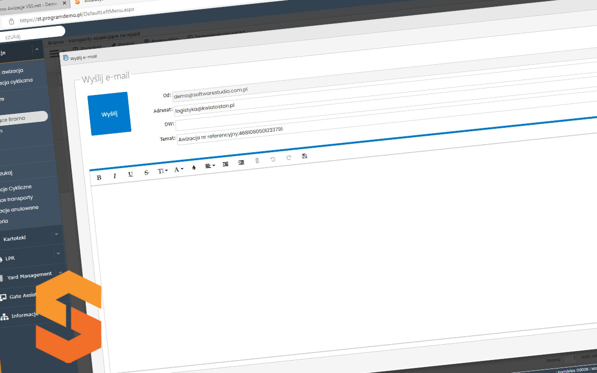 Korzystam z modułu wysyłki wiadomości email zintegrowanego z systemem zarządzania placem YMS firmy SoftwareStudio, który umożliwia mi szybką i skuteczną komunikację z przewoźnikami, kontrahentami oraz kierowcami bezpośrednio z poziomu platformy awizacyjnej. To narzędzie stanowi kluczowy element procesu awizacji dostaw, pozwalając na natychmiastowe informowanie wszystkich zaangażowanych stron o zarezerwowanych terminach, przydzielonych rampach, zmianach w harmonogramie lub innych istotnych wydarzeniach związanych z planowanym transportem. W górnej części formularza widzę pole „Od”, które automatycznie uzupełnione jest adresem email odpowiadającym zalogowanemu użytkownikowi systemu (w tym przypadku demo@softwarestudio.com.pl), co zapewnia spójność komunikacji i jednoznaczną identyfikację nadawcy.