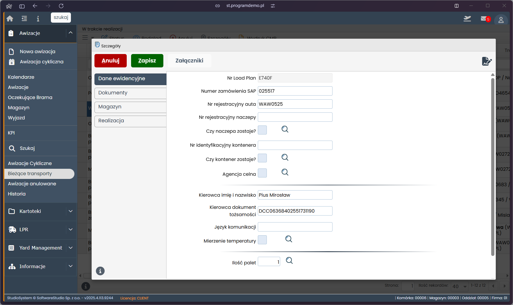 Użytkownik aktywnie wprowadza dane ewidencyjne transportu do modułu edycji awizacji VSS.net. Wpisuje dokładnie numer zamówienia SAP. Następnie użytkownik dodaje numery rejestracyjne pojazdu i naczepy oraz identyfikator kontenera. System natychmiast pozwala zaznaczyć, czy naczepa albo kontener zostają na terenie zakładu. Dzięki temu łatwiej zarządzamy przestrzenią magazynową i lepiej planujemy logistykę.