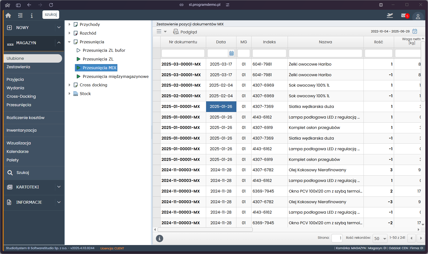 Ekran „Przesunięcia MIX” w Studio WMS.net to intuicyjne narzędzie. Pomaga ono efektywnie zarządzać logistyką wewnętrzną. Użytkownik ma pełną kontrolę nad ruchami towarów. Widzi szczegóły każdej operacji. To wspiera zarządzanie magazynem.