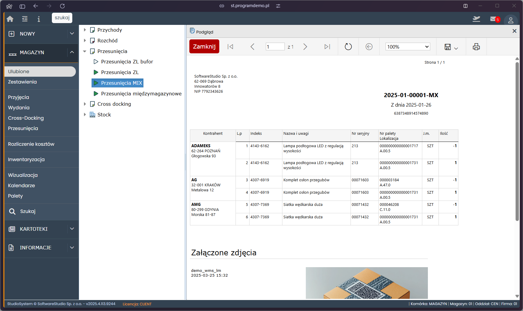 Po wybraniu konkretnego przesunięcia z tabeli, po prawej stronie ekranu pojawi się panel Podgląd. Panel wyświetla szczegółowe informacje o wybranym przesunięciu. Znajdziesz tu takie dane jak: Dane kontrahenta, czyli informacje o firmach zaangażowanych w przesunięcie; Indeks, Nazwa, Uwagi, Nr seryjny, Nr palety, Ilość oraz Lokalizacja, czyli szczegółowe dane dotyczące produktów. Jeśli do przesunięcia dołączono zdjęcia, na przykład zdjęcie uszkodzonego towaru, zobaczysz je tutaj.
